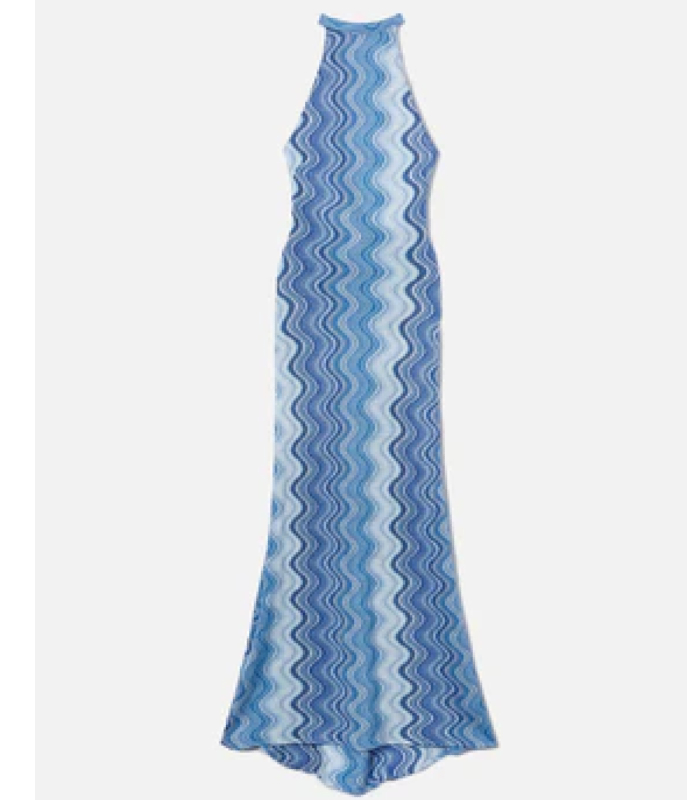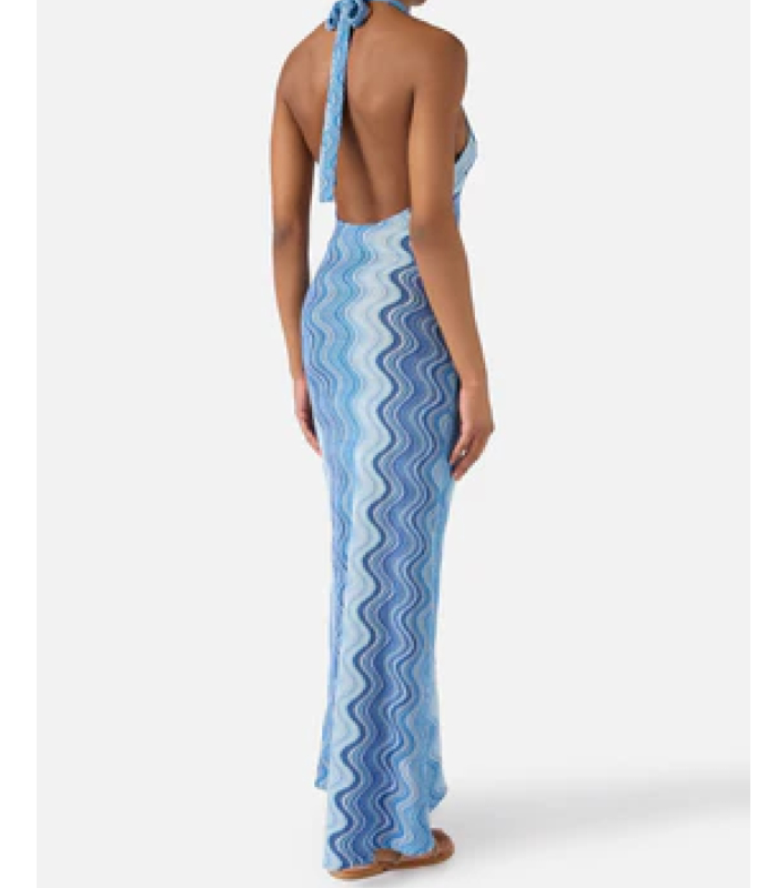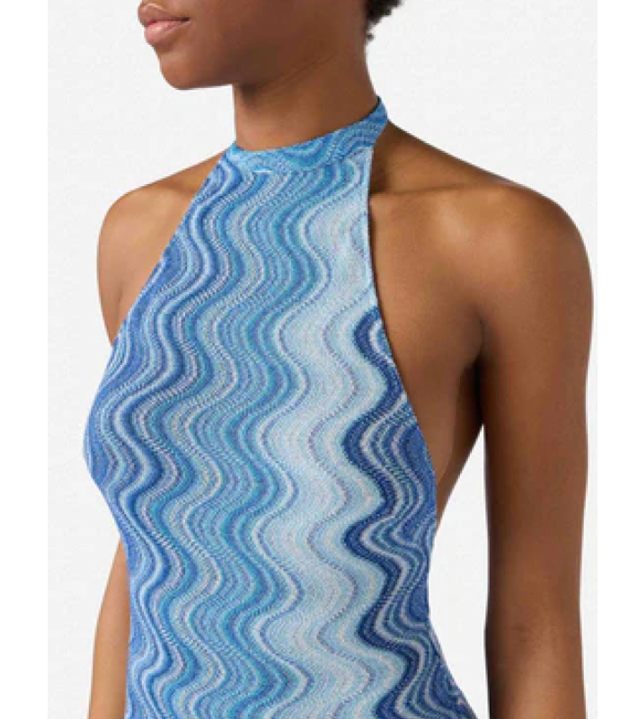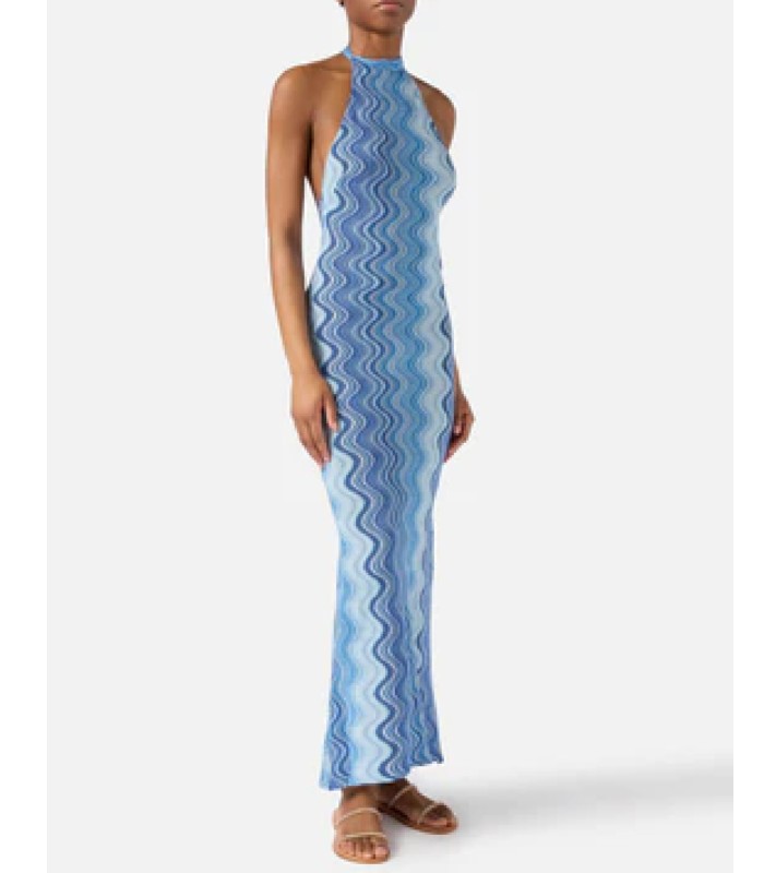 L’abito lungo Tony è realizzato in tessuto raschel con motivo ondulato degradé multicolor nei toni dell’azzurro e del bianco. Il design definisce il modello con un carattere grafico dinamico e contemporaneo. Lo scollo all’americana con laccio da annodare dietro al collo e la linea smanicata completano il capo, mentre la schiena scoperta aggiunge un dettaglio distintivo. La gonna dalla linea fluida accompagna il movimento con naturalezza.