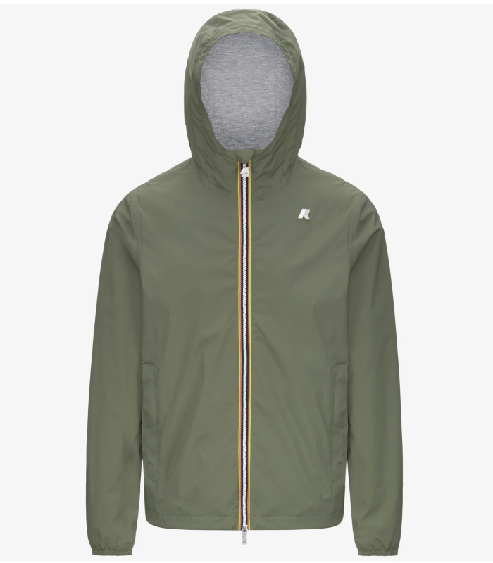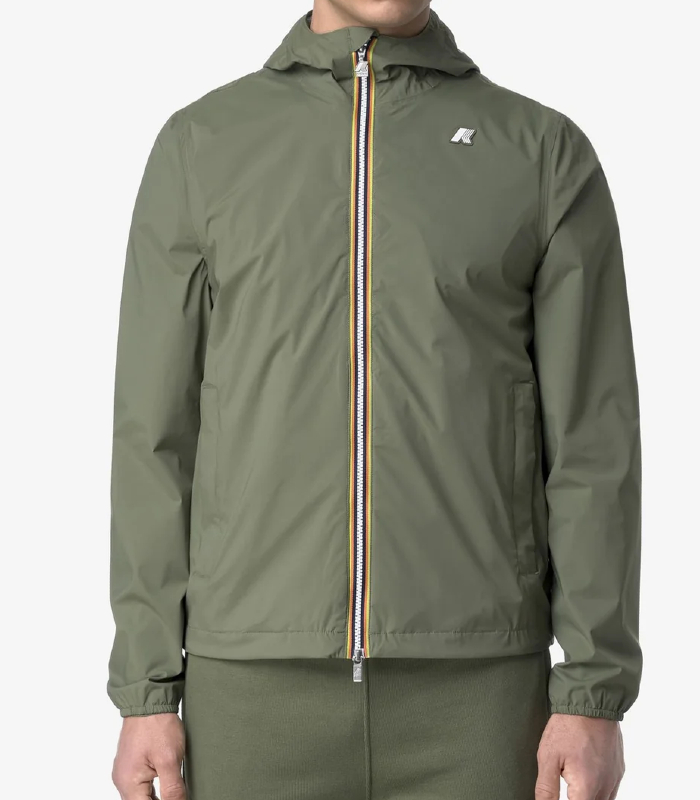 Jack è una giacca da uomo con vestibilità slim, realizzata in nylon stretch resistente agli agenti atmosferici e rifinita con una fodera in morbido jersey di cotone grigio melange applicata solo su fronte e retro, per garantire comfort superiore e una piacevole sensazione a contatto con la pelle. L’interno è curato nei dettagli con cuciture termonastrate e l’iconico tape multicolor K-Way applicato al punto vita, che aggiunge una nota distintiva al design.