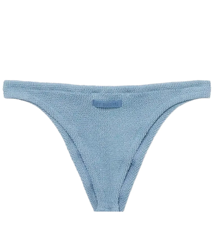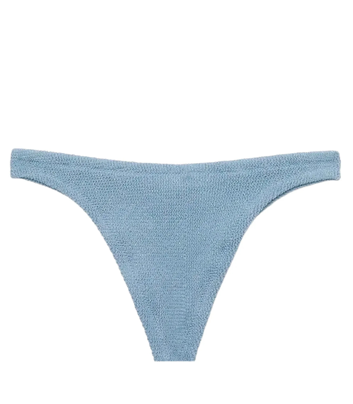 Lo slip mare Naomi è realizzato in tessuto tecnico elasticizzato effetto crinkle, progettato per garantire comfort e vestibilità. Il colore celeste tinta unita definisce un’estetica essenziale. Il modello presenta copertura cheeky e lati chiusi.