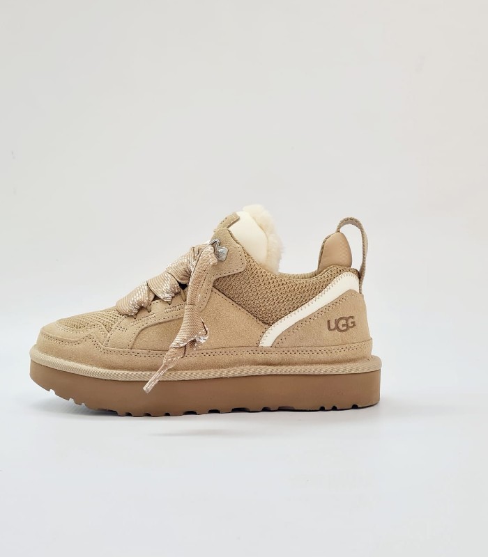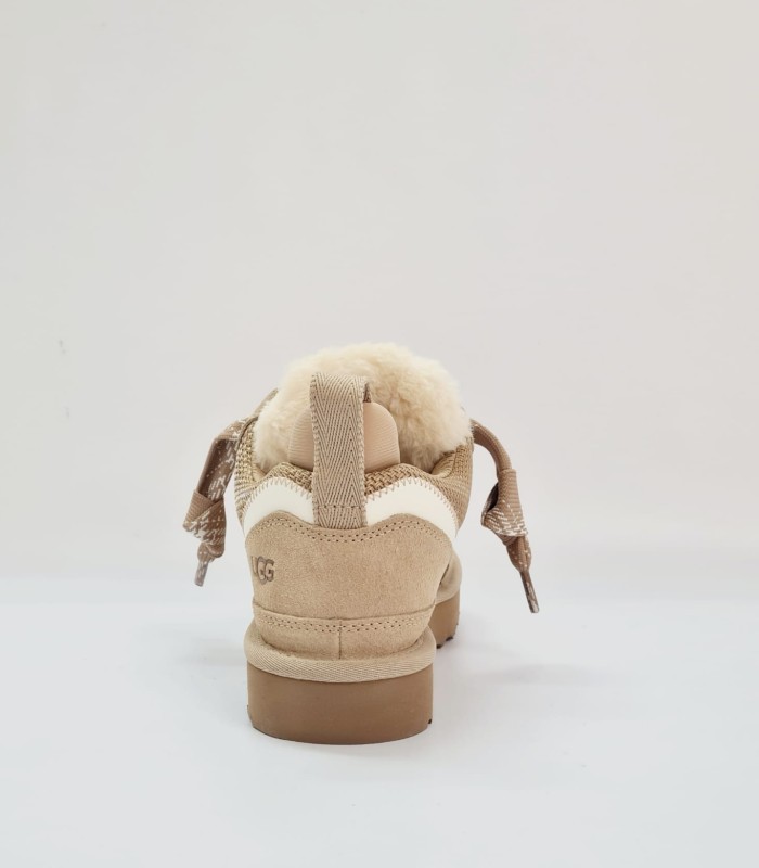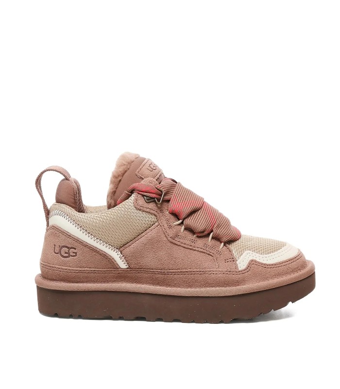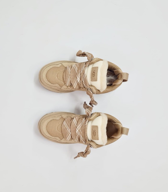 • Tomaia in rete di tela intrecciata riciclata e camoscio, cinturino sul tallone in tessuto resistente, applicazione con logo UGG®, collarino imbottito, linguetta oversize imbottita